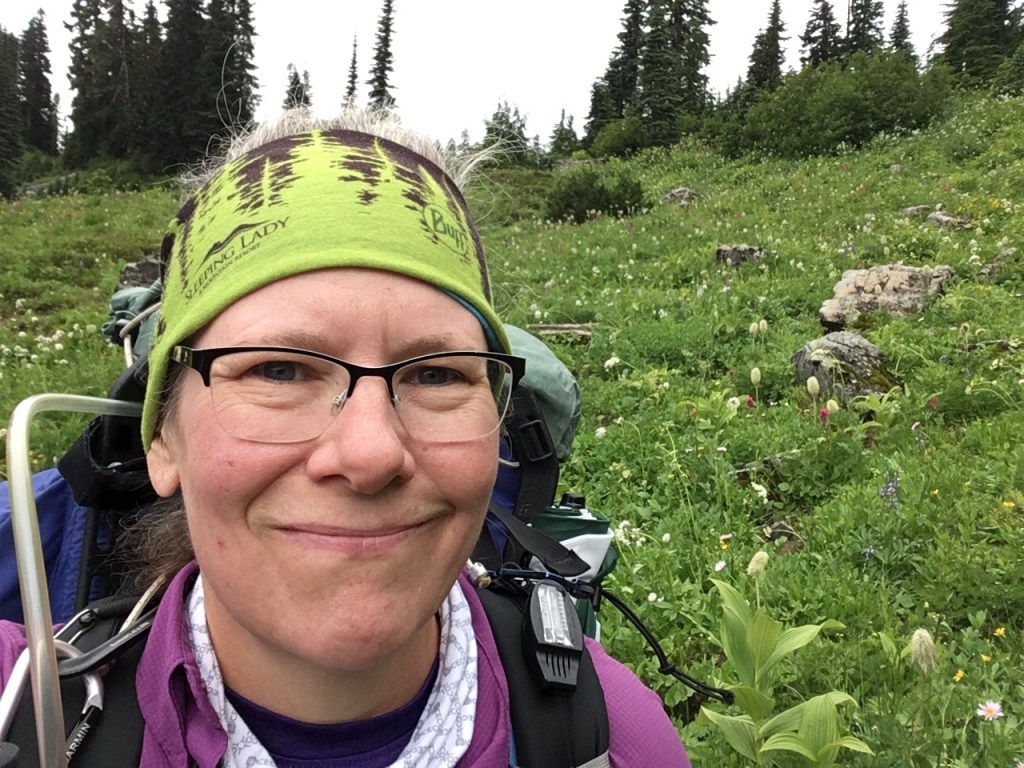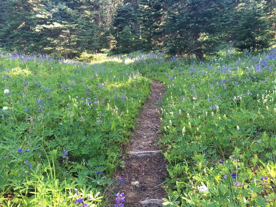Sunday left me with about a 13 mile hike. The first stretch was more climbing to get up to the Pacific Crest Trail, and the PCT took me back to the trailhead. It was a long, hard day. I’d been lying in my hammock, feeling my leg muscles ache. I knew the climbs would be hard. On the plus side, unlike the Laughingwater Creek Trail, this section of the PCT is gorgeous. I was treated to my first view of Mount Rainier a short ways before the junction with the PCT, and the mountain made regular appearances. There at the junction I could see Adams, St. Helens, and Rainier. The wildflowers were glorious. Even when I was miserable, the trail was pretty special.