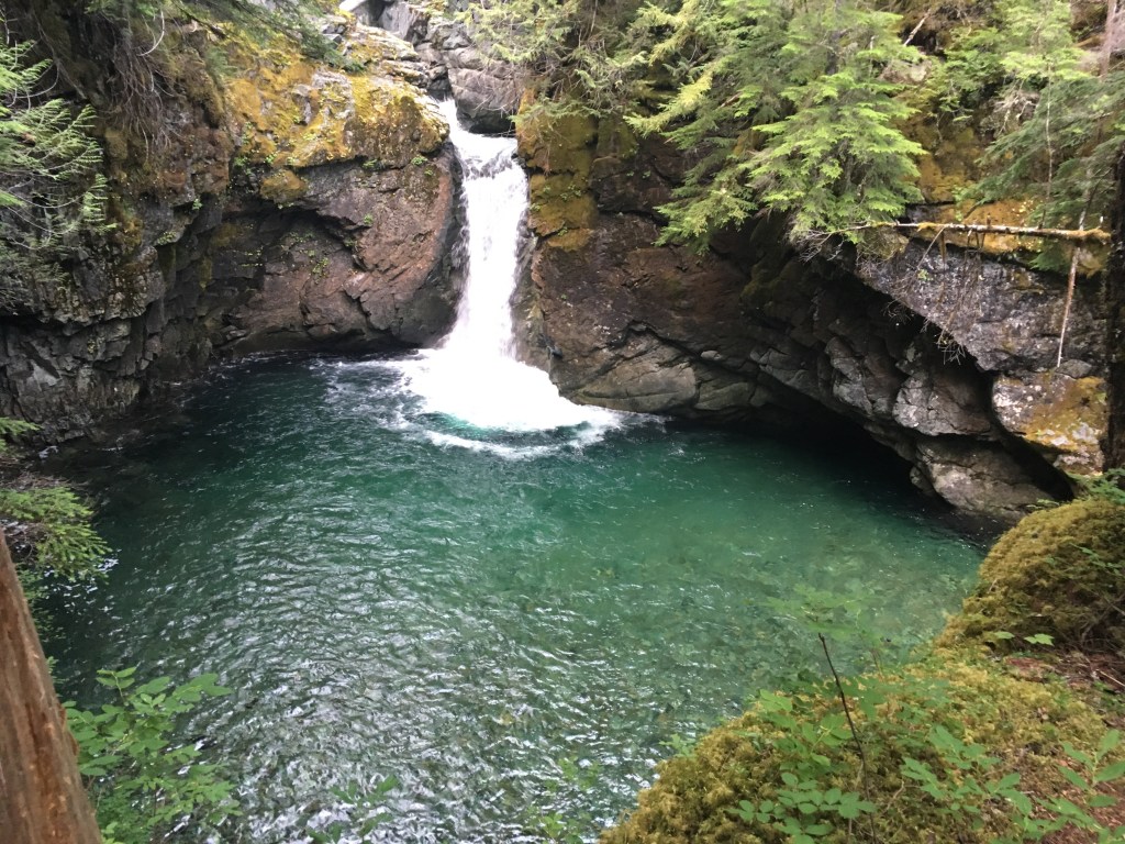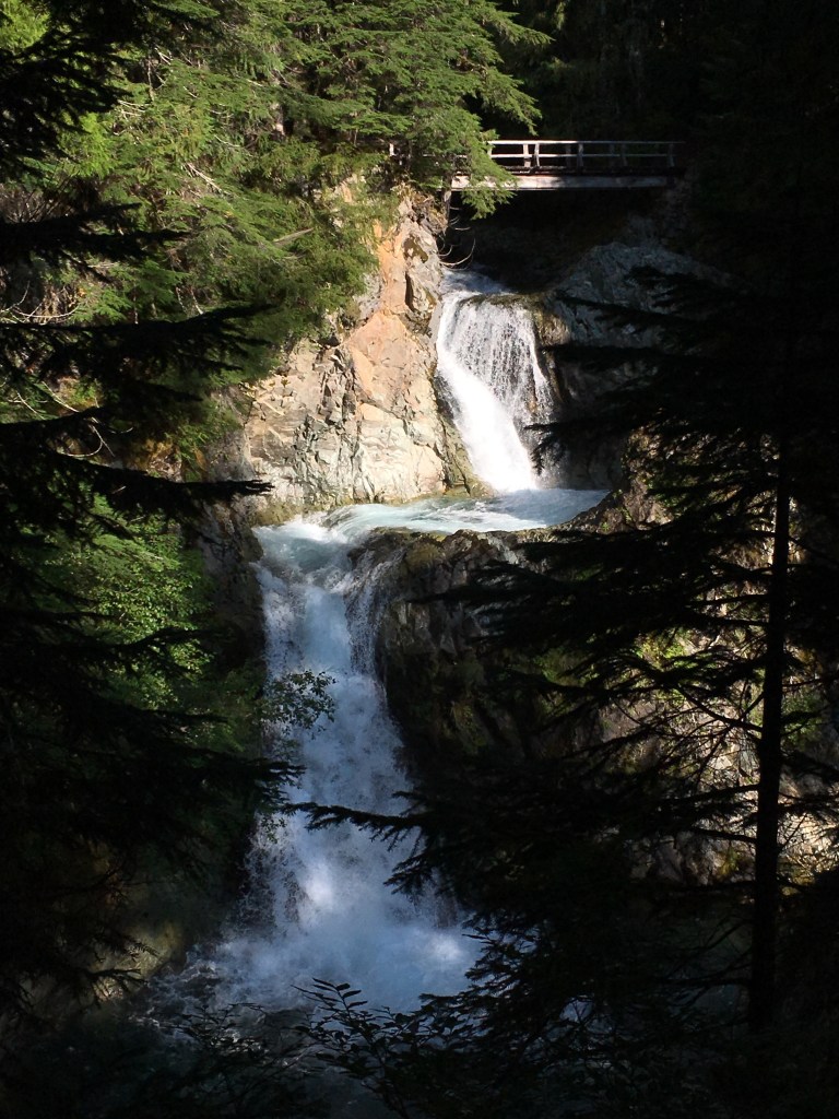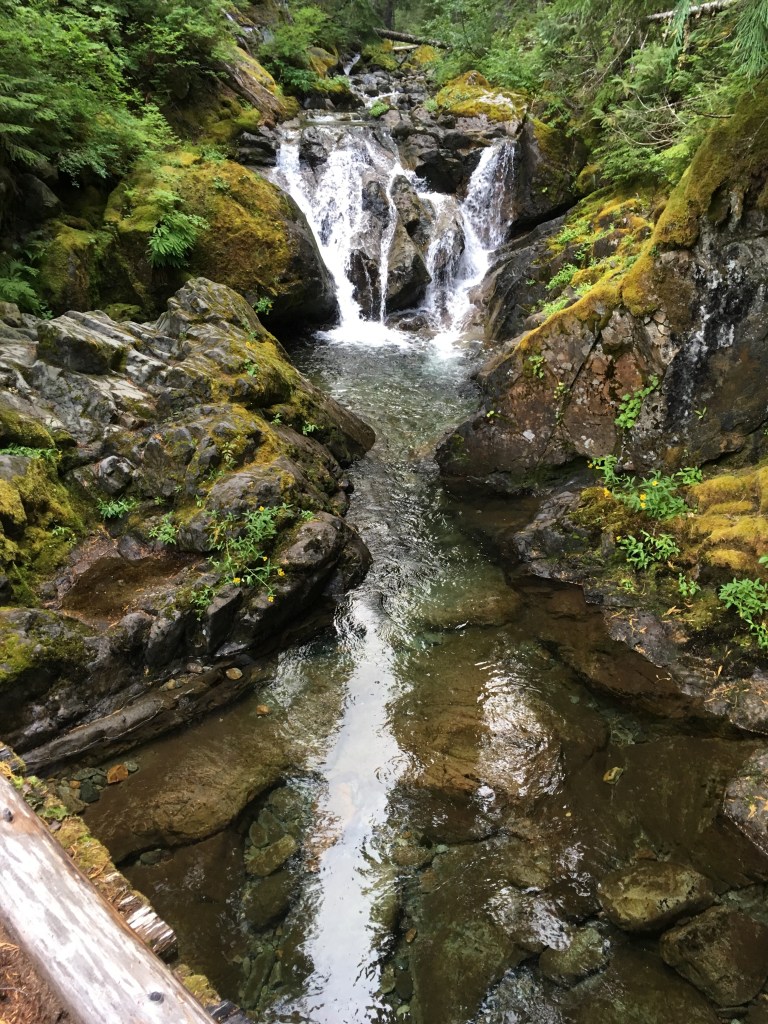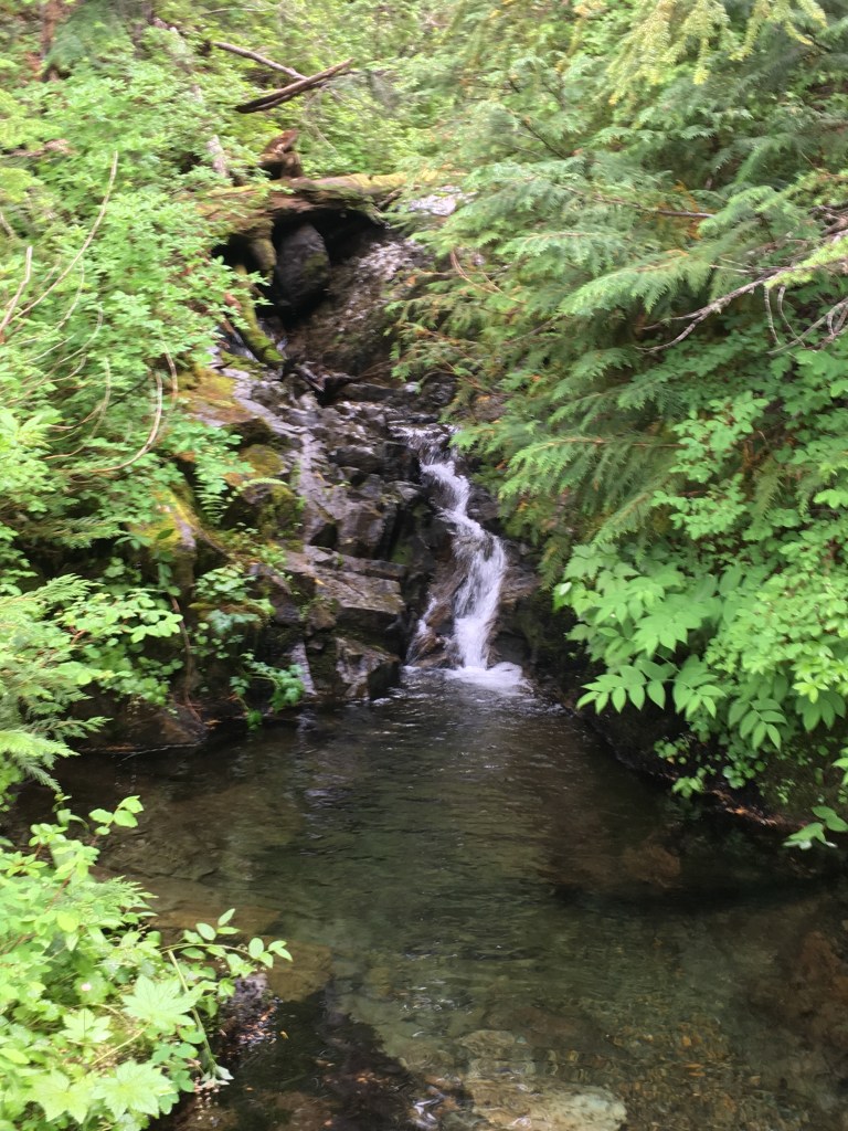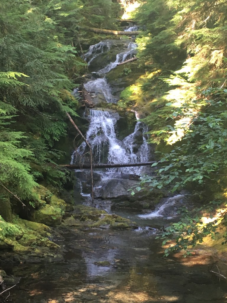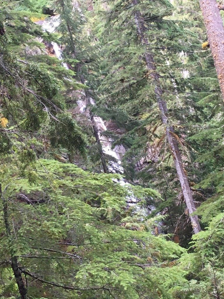 I hiked in about seven miles on Friday. I didn’t see another person after leaving Tipsoo Lake. (Despite the rain & low clouds, there were a lot of people at Tipsoo Lake.) The map did not lie – the East Side Trail passes numerous waterfalls. You’ll get no soaring views of Mount Rainier, but you’ll be accompanied by babbling brooks & plunging waterfalls along the way.