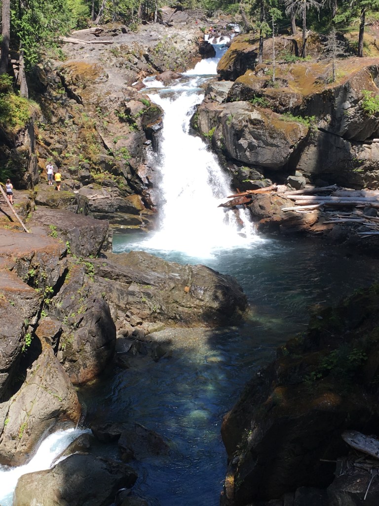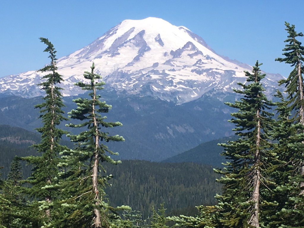 I decided I’d stop at the Grove of the Patriarchs because I figured people would ask me if I’d seen it & then express their dismay that I hadn’t. It turned out to be a nice place for second breakfast. There was a group of four adults in the same area I was. One of the women offered to take a picture of me in front of a couple of the trees. The man asked me about my hiking trip. Another woman in their party looked very familiar to me, and as I talked to the man he seemed familiar, too. I told the woman she looked familiar, and she told me her name — it was Justice Stevens of the Washington State Supreme Court. I interviewed for a clerk position with her when I was in law school. We chatted a bit more, and later it dawned on me why the man seemed familiar, too: he’s Brian Harnetiaux. Then-judge Stevens & Mr. Harnetiaux taught a class I took my last semester of law school.
