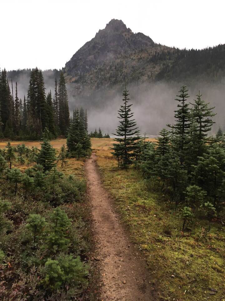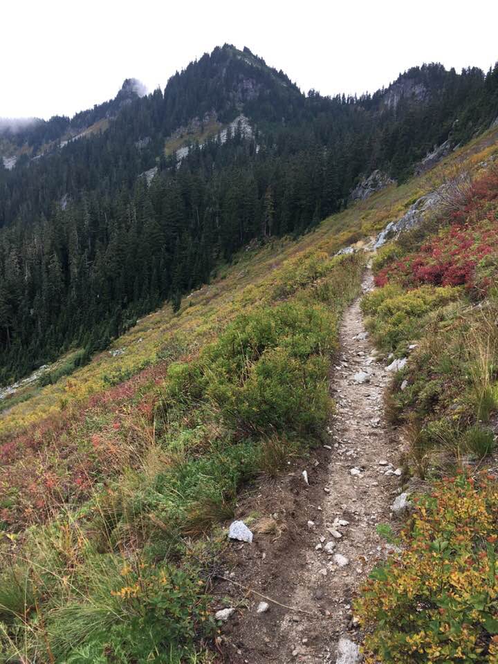 There’s a spot along this section, about seven or eight miles north of Snoqualmie Pass, where the trail crosses over an arm of Alaska Mountain. The saddle is only about 10′ wide at that point. The pass is unnamed, but it deserves some fanfare. It marks the end of the worst of the climbing. There’s still about 450′ of climbing getting out of the Ridge Lake area, but it’s almost all downhill from here. For a sobo, this is a moment of joy. This pass deserves a name!