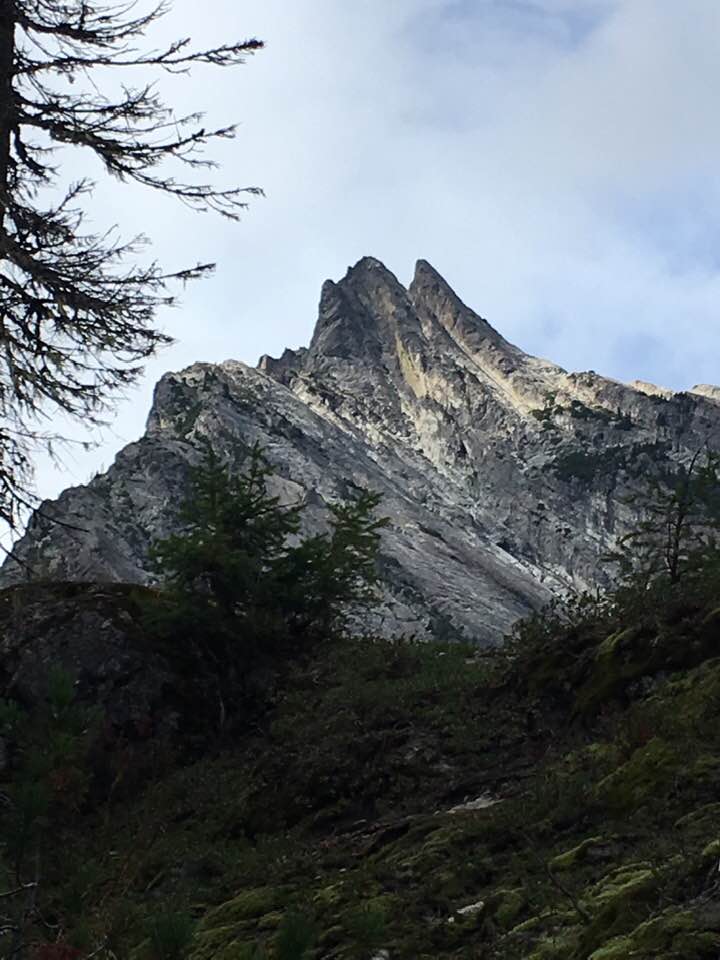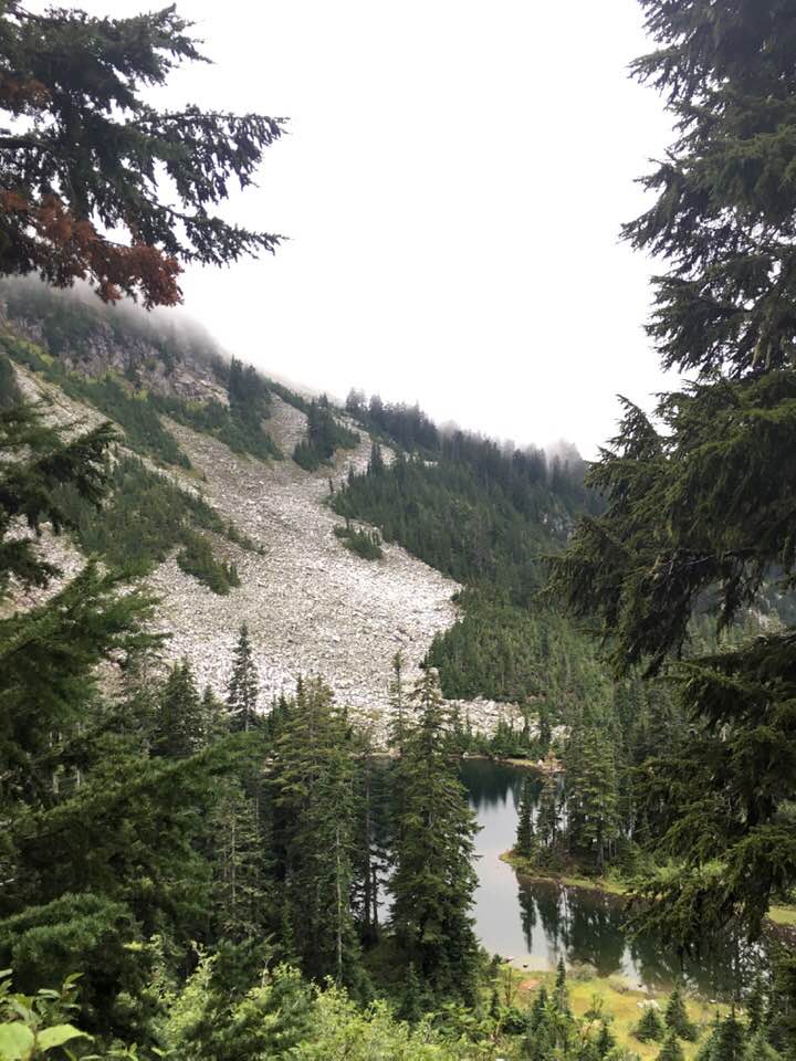 I’d really looked forward to Day 3, as I was entering territory I’d hiked a few decades ago. Last year, Deception Lakes was my give up & turn around spot; hiking away from it, heading southbound, was an emotional boost. It was a rainy, cloudy day, meaning I didn’t get to see Cathedral Rock or much else. I didn’t see Cathedral Rock until I was headed downhill, away from the turn-off to Peggy’s Pond & toward Deep Lake.