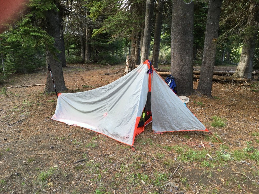 Now, about my new tent: It weighs less than two pounds. It’s all modular: the tarp is separate from the mesh inner tent and the vestibule. The maker says that the tent can hold two people but they acknowledge it’s a very tight squeeze that only gram-conscious thru-hikers are likely willing to endure. Two full-length sleeping pads will not fit, but two 3/4 length pads probably would. I love that I can sit upright inside the tent. (The peakline slopes sharply, so it’s just at the very front by the door that I can sit up.) This means I can sit up with my legs out of the tent to take off my shoes, then spin around. It makes getting in & out of the tent easier. Being able to sit upright means it would be fairly easy to cook in the vestibule if one was so inclined. You can see in the picture to the right that there’s a lot of room in here. I could easily store my pack inside the tent (I generally don’t). While it’d be a squeeze for two adults to sleep in this tent, it looks like an adult & a small-ish child would be fine, and a human & a dog could easily share this space.