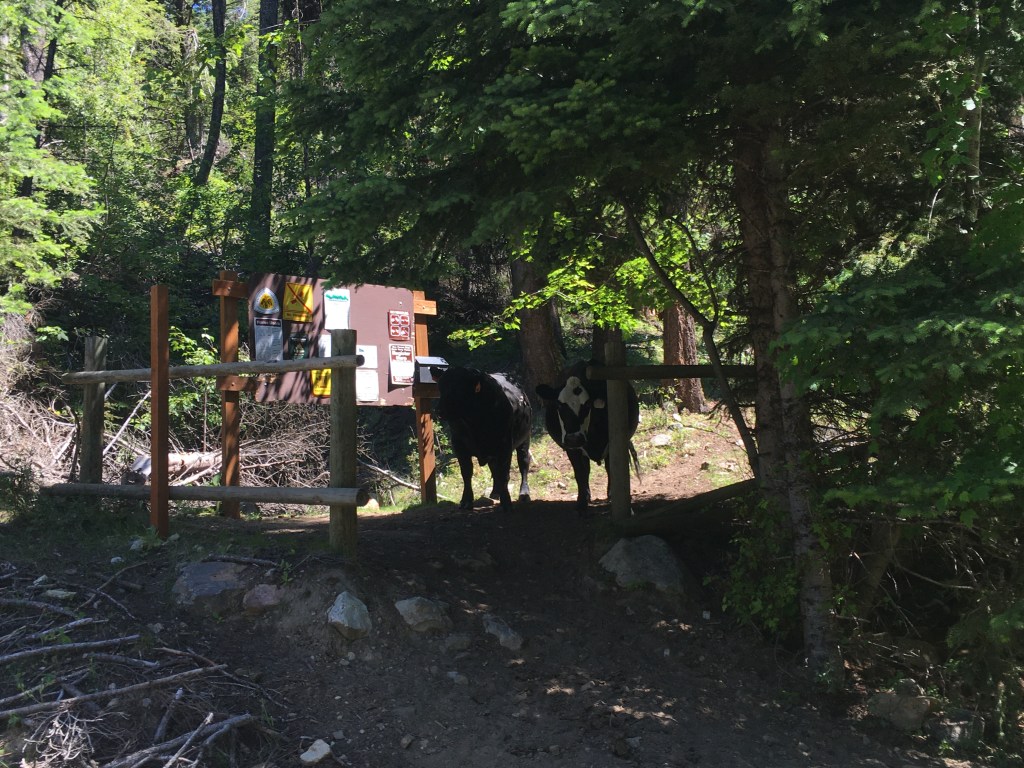 I arrived at the trailhead before noon. I saw a bear trotting through the woods on my way to the trailhead – a reminder to always store food properly. Upon arrival at the trailhead, the first thing I noticed were cows. There was a cow standing at the beginning of the trail, watching me intently. Nearby, a young steer was approaching me, apparently curious. I saw a group of cattle coming down a cow path towards the parking area. One of them was huge. I then noticed the chest – yep, it was a bull. He stopped, so the group stopped.