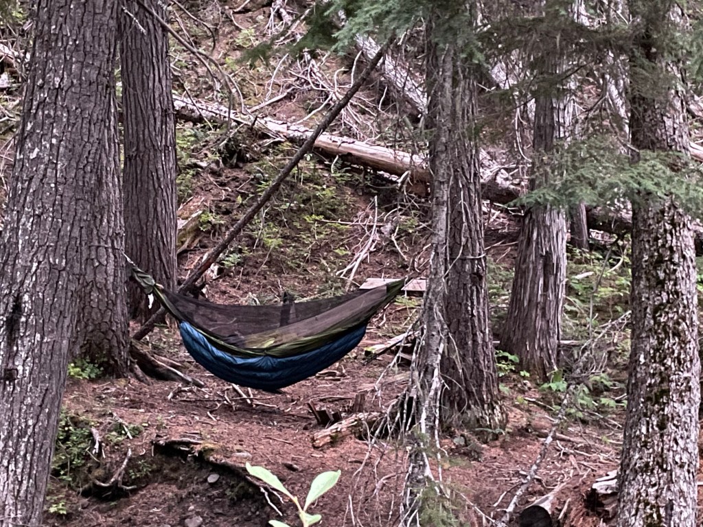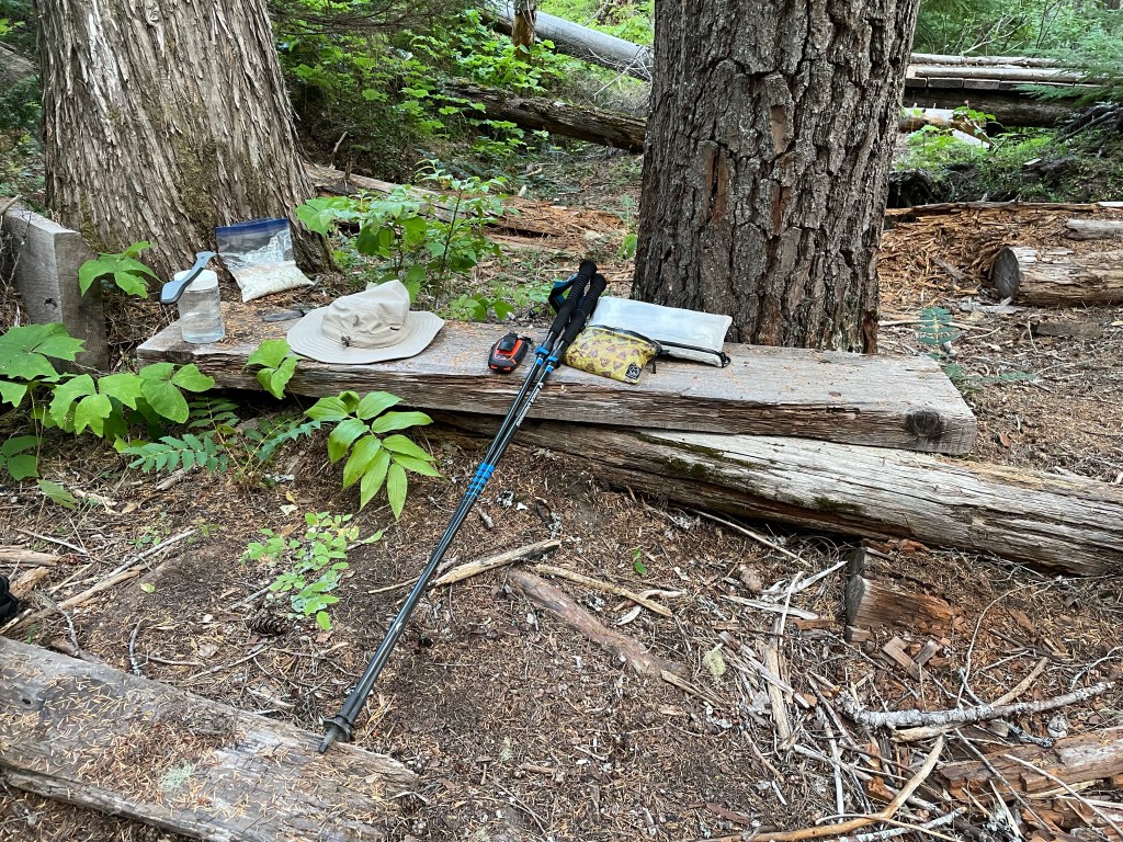 It’s about an hour drive from the office, and with sunset shortly before eight I figured I could get in a few miles that evening. This area burned in 2017, and while it’s recovering burned areas tend to have a lot of dead trees. That can complicate finding a campsite. I found a decent-enough campsite about a half-hour before sunset. The hike to my camp area is mostly flat. A short distance after this spot, the trail starts to climb. About 2/3 of a mile past my camp, there’s a short side trail to Pleasant Valley Lake. It’s not much more than a pond now, but there are a few campsites in the area. According to one trip report, this lake used to be stocked with trout, and there are a few remaining.