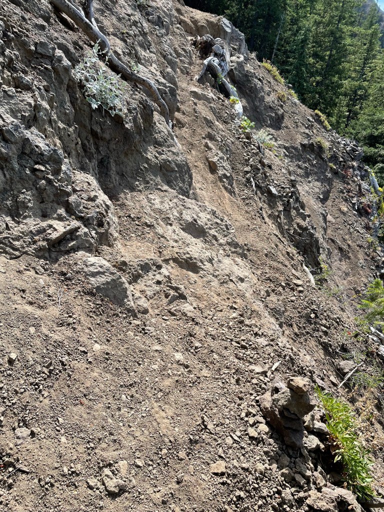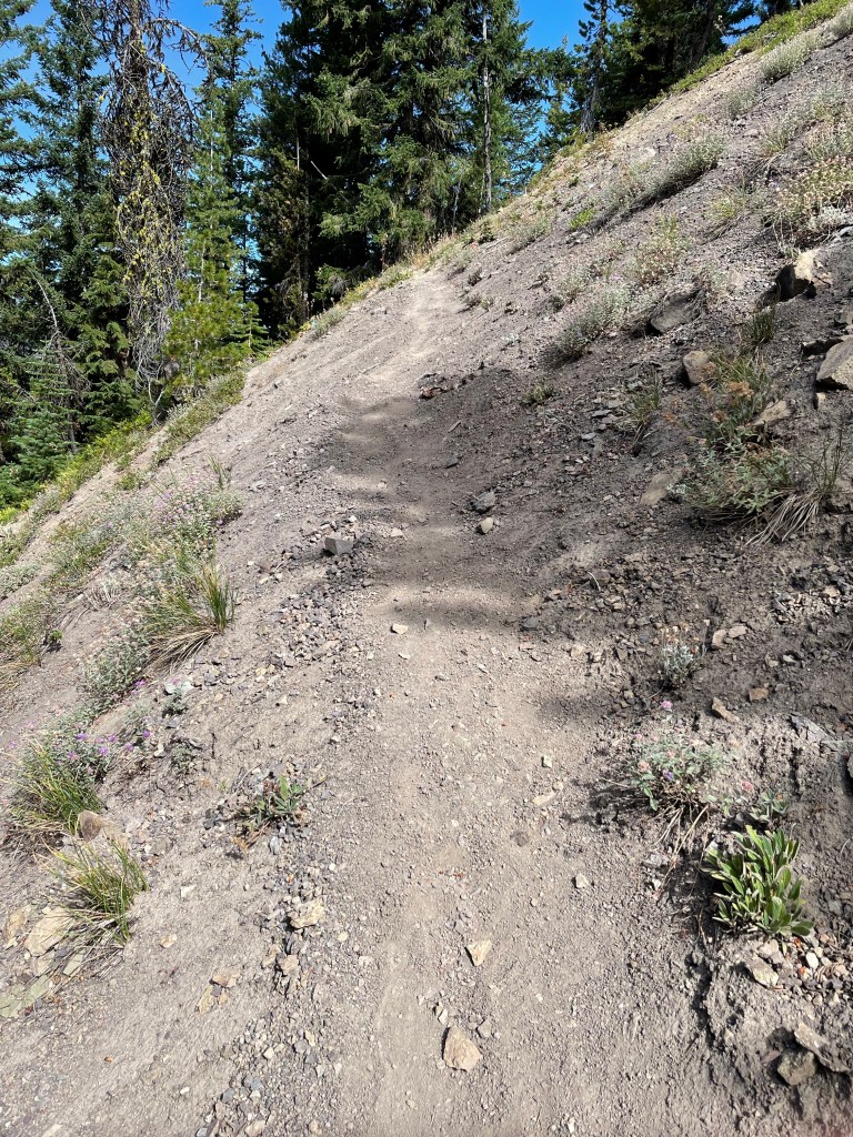 And now the descent begins… the trail is steep near the summit, and practically a scramble. In many places, the tread is the same loose ashy/dusty soil. The first time I fell, my right foot slid off the edge of the trail. The second time, my feet slipped out from underneath me. I fell backwards, twisting my right leg – the one with the *good* knee. Several times on the way down, my right foot slipped, further aggravating my already-mad ankle.