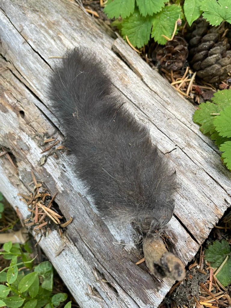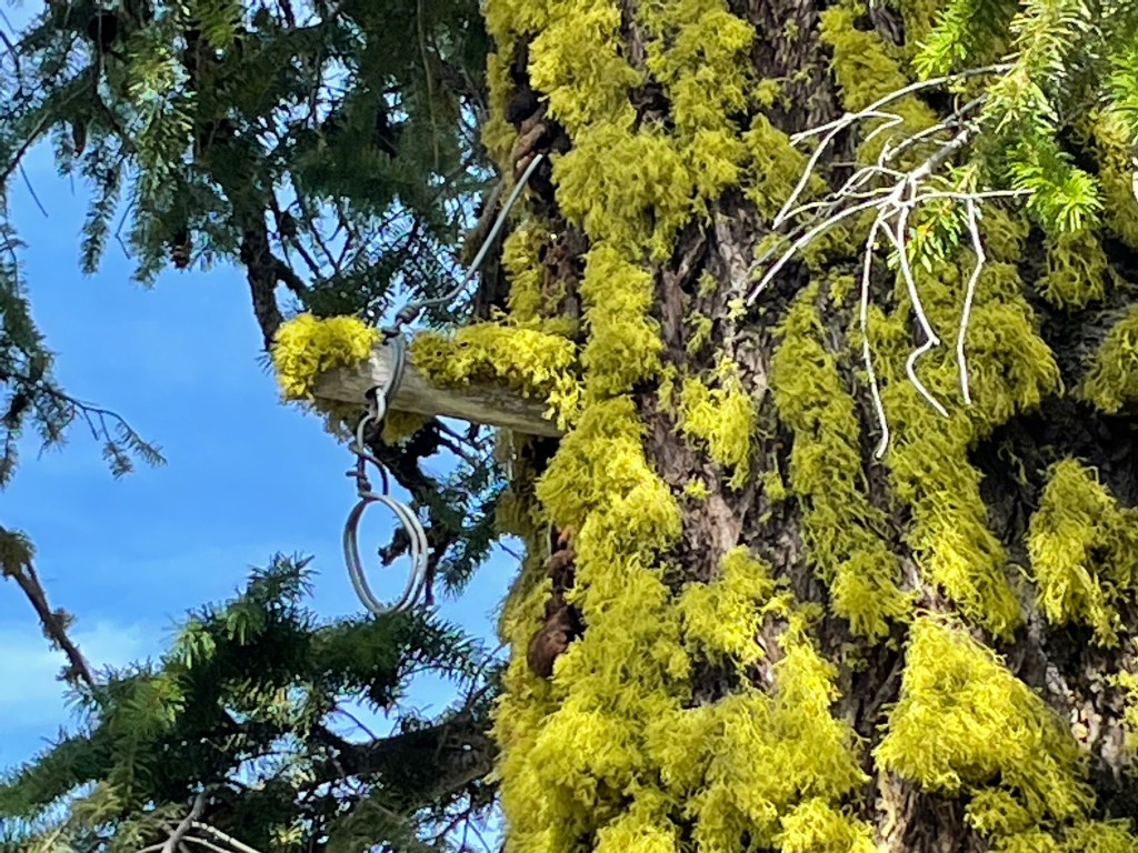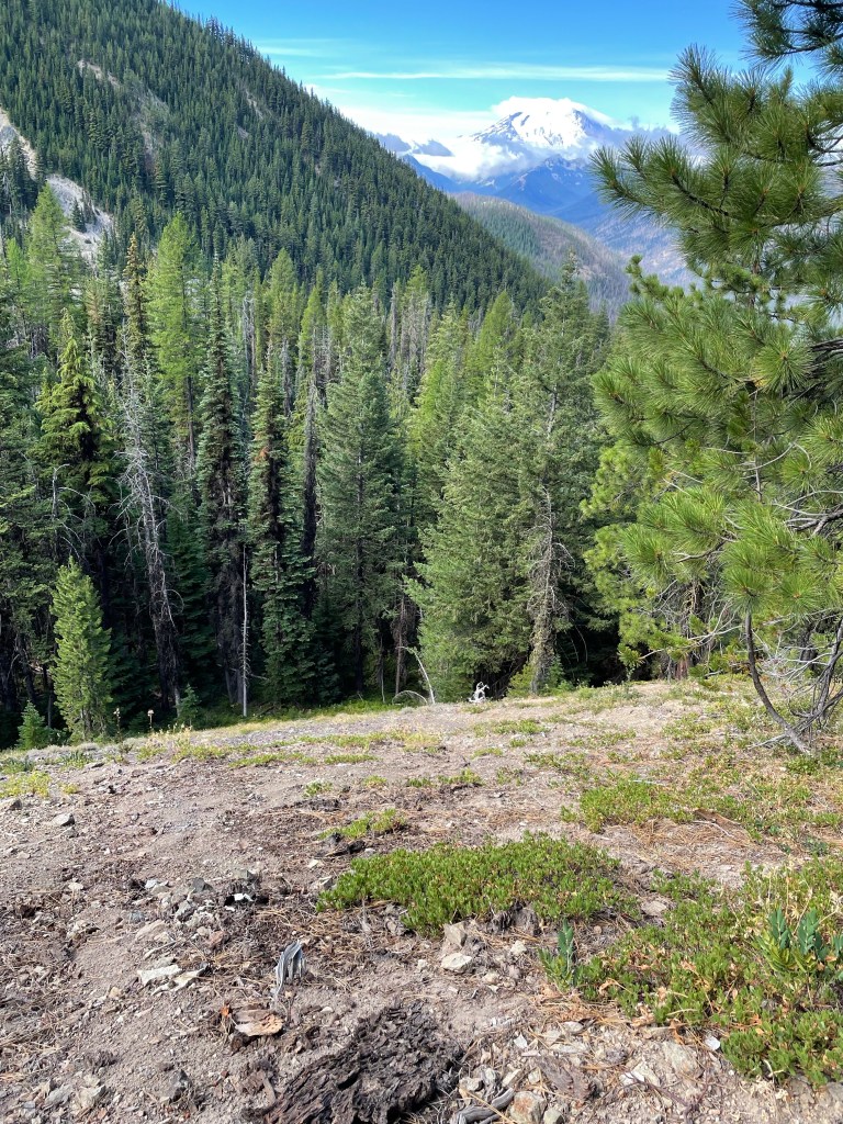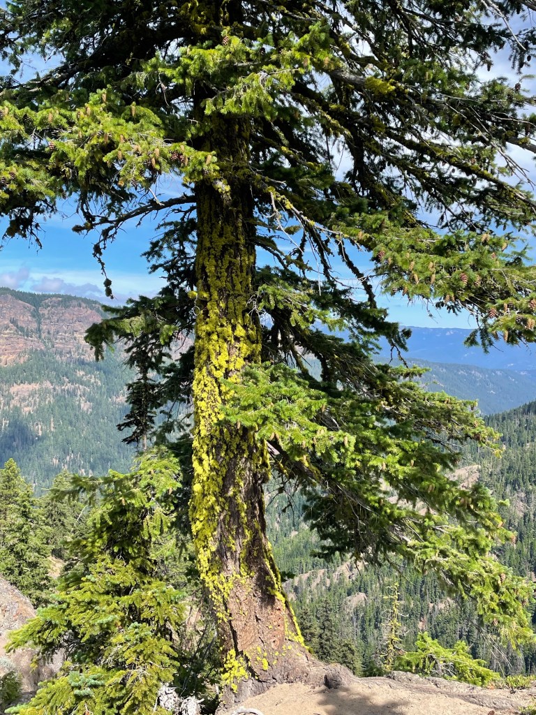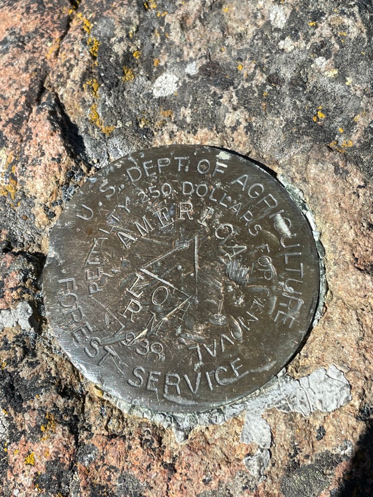 I finally made it to the top. There was a fire lookout up here from 1933-1968. In addition to the USFS survey marker, I found a metal eye bolt secured in one of the rocks. There’s the base to a lightning rod nearby. There were also some nails. One the way down, I passed two attachments to trees about 10-12′ above ground which could have held communication wires.