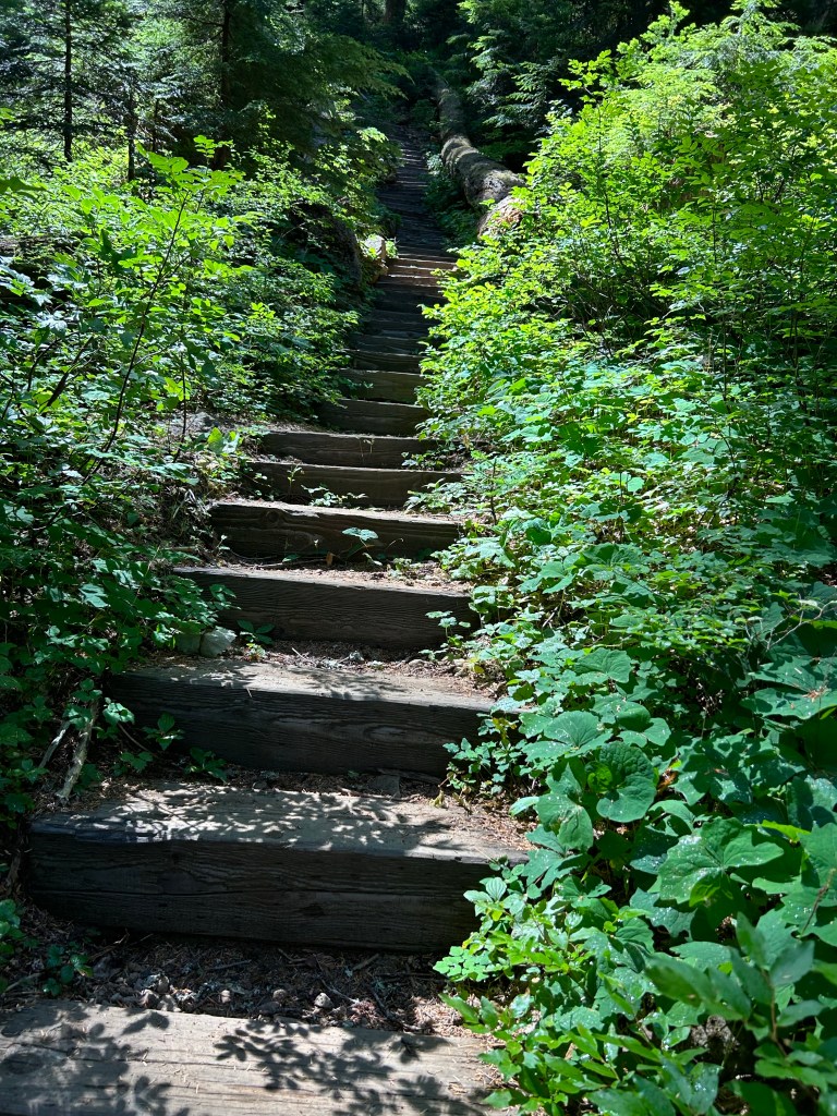 Yep — the trail is almost entirely stairs. My guess is that this trail was originally a game trail and people started using it, and then the US Forest Service decided to “improve” the trail instead of cutting a new trail with switchbacks. This trail is short and steep. Fortunately, it has lots of slow vehicle turnouts where we stopped to enjoy the view.