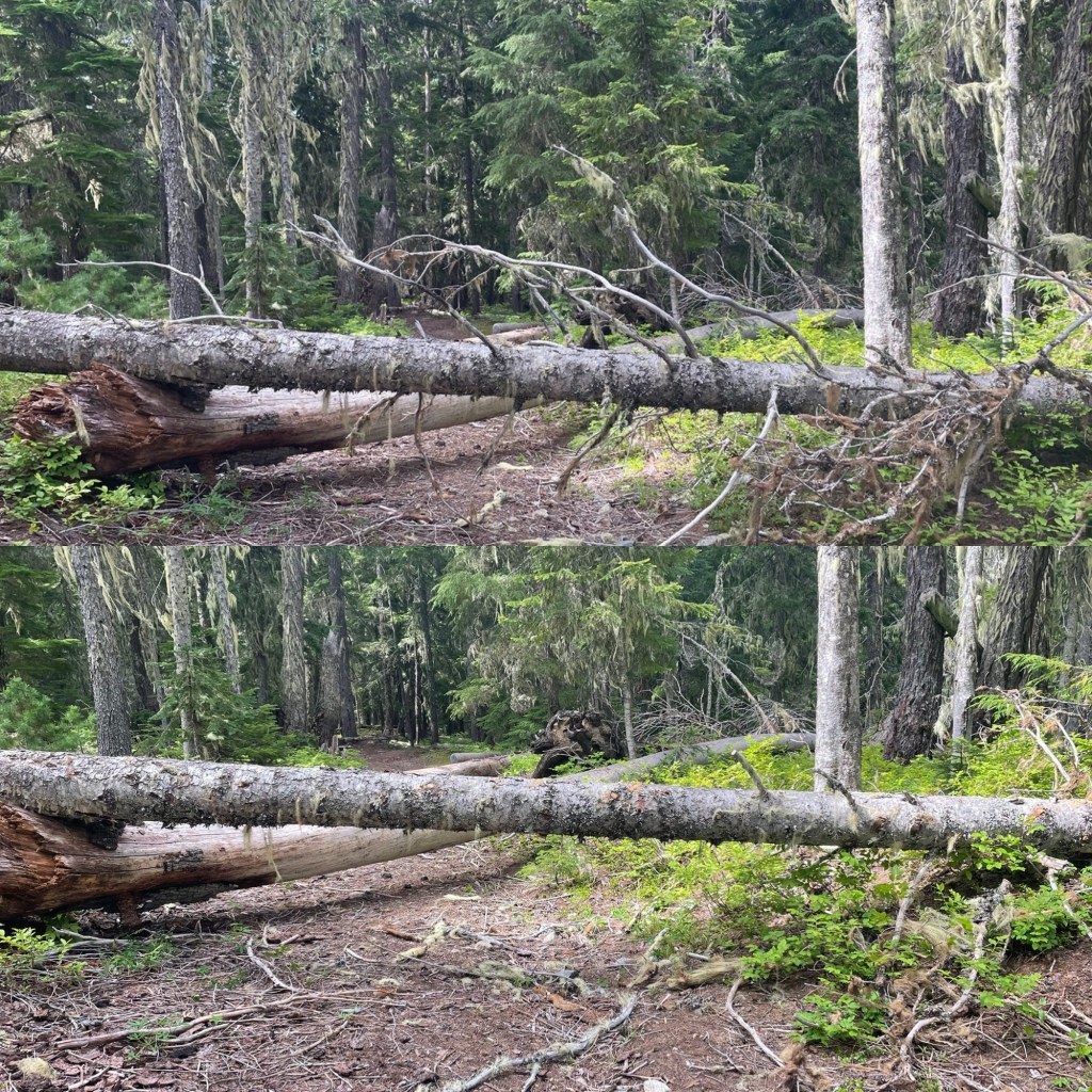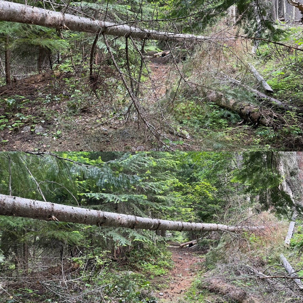 The spot of the old trailhead is in very good shape but for the pit toilet with the sign “Out of Order – Toilet Full.” 🤢 (I did not verify that assertion.) The trail itself is an old roadbed for much of the way, so it’d be easy hiking but for the washouts & blowdowns.