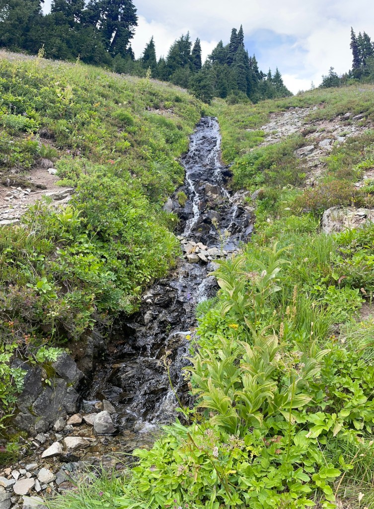 I started the day hoping to make it well past Old Snowy before camping, but I wasn’t even close. The FarOut app didn’t show any water sources along the trail through Snowgrass Flat, and I didn’t want to risk having to push myself too far to get to water. Comments in that area noted that there is water, but I wasn’t thinking of that at the time. I stopped a little earlier than I’d planned at a large camp area at the junction with the Bypass Trail. It was a mile past the last water source along the trail in the Cispus Basin. I figured I’d hike back to it first thing in the morning without my full pack. The day’s mileage: 4.4 miles. 😔