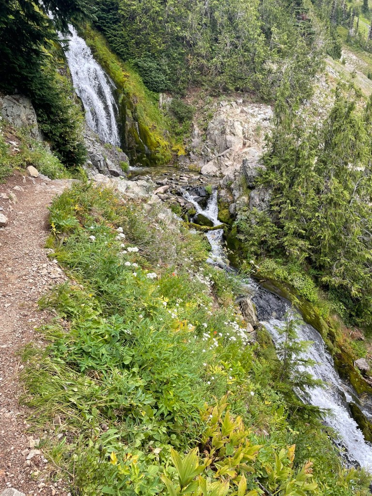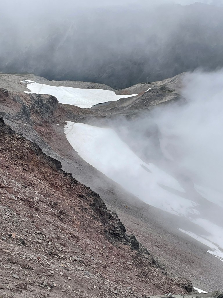 It was slow and a bit scary. I don’t know why I found it so difficult, but that short, non-challenging snowfield was very difficult for me. As I came to the end and stepped on to dirt, a SOBO hiker told me that given how much I struggled across the snowfield, she strongly recommended I take the Old Snowy Alternate instead of trying to cross the Packwood Glacier. I’d heard from another SOBO earlier that Old Snowy was socked in with fog, so she recommended taking the glacier route to avoid the elevation gain & loss that comes with the Old Snowy route. Had it not been for that person standing at the north end of the snowfield, I probably would have.