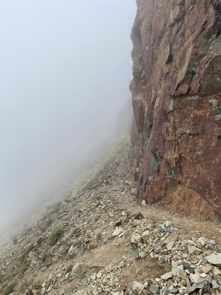 The angel who steered me toward the Old Snowy Alternate told me there was a sheltered area at the high point. I stopped there for lunch. The Knife’s Edge was the next challenge. Heights don’t generally bother me, but it was breezy & foggy, and I have limited depth perception. The depth perception issue can be a problem when the light is weak – such as at twilight or in fog. Yay.