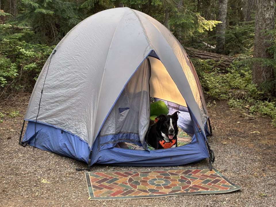 Jim arrived on Sunday. We camped in Mazama Village for the night. The next day, we began our meandering trip back to Pasco. We first went to Shelter Cove. We enjoyed a meal on their deck while Trooper napped in the truck and I retrieved my resupply box. We camped that night at Shadow Bay on Waldo Lake. We found the perfect spot for Trooper & us – lots of shade, no neighbors within sight, and plenty of things of Trooper to sniff. That night, he slept parallel with the door, blocking my exit, with his head on my legs. He was not taking any chances. I got up in the early hours of the morning to pee, and he watched me the entire time.