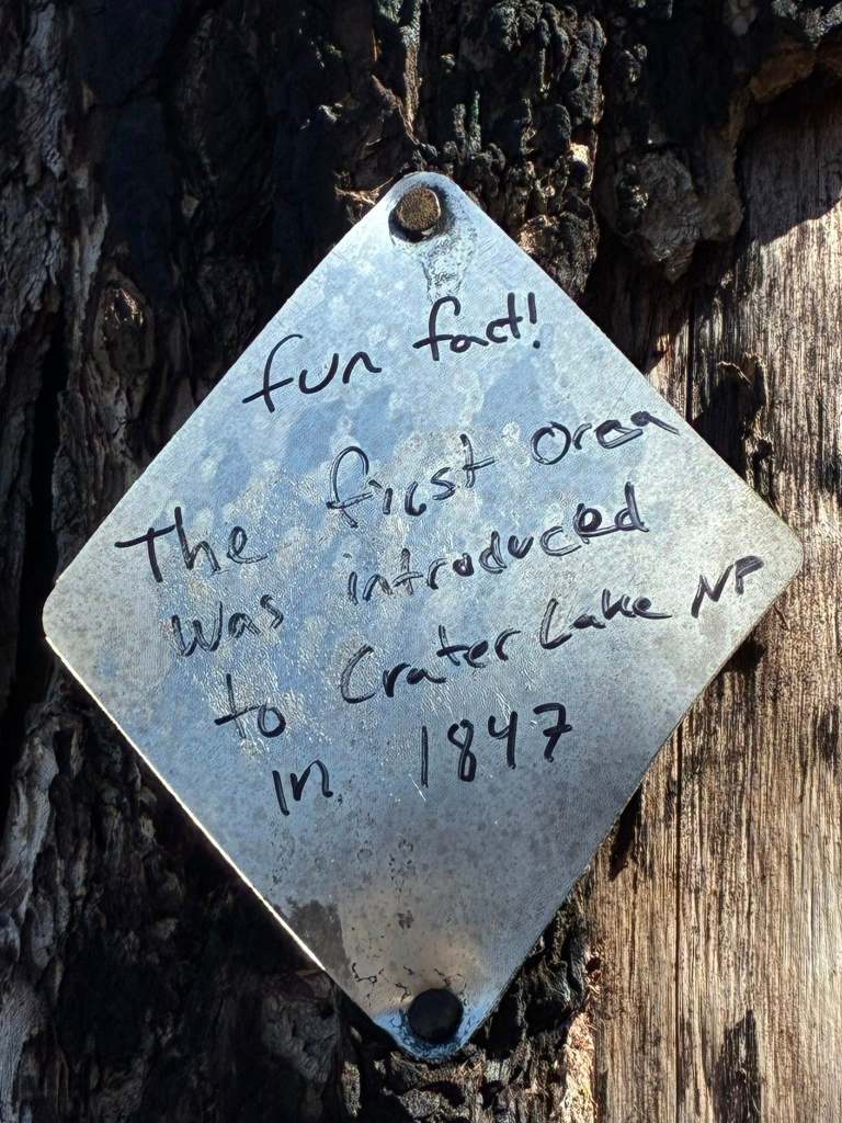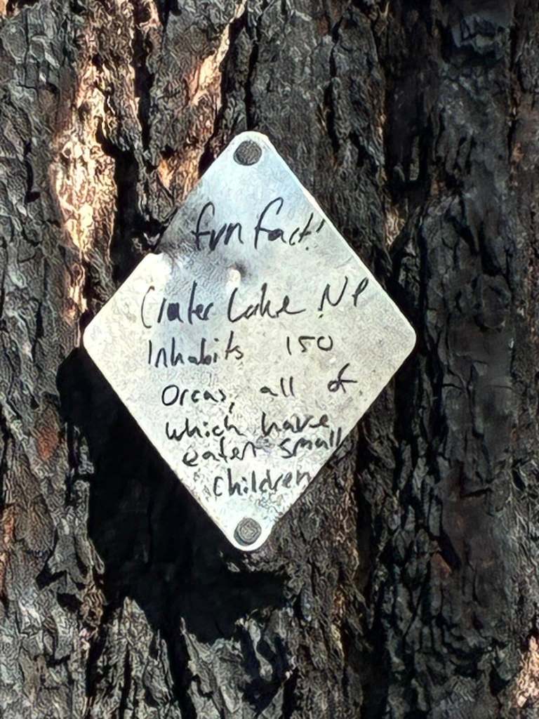I knew I’d be at this site for a few days while I waited for Jim to return to Southern Oregon to pick me up, so I really settled in. I didn’t sleep well the first night, and I made the following day a decidedly lazy day. I spent much of the morning at the businesses at Mazama Village. Hot coffee & Hot Pockets for breakfast – a meal only a long-distance hiker or a hungover college student can appreciate – charge my phone & my battery packs, bought some souvenirs and a replacement pair of socks. I saw Avocado at the village. She was, as before, very kind and supportive of my decision to end my trip. She was heading out on the trolley that tours the park. I passed on that option and headed back to camp for a nap. Before I dozed off, I saw a young bunk – a deer, not a human – with two velvety horns dart though the hiker camp not far from me. (Most humans were over in the village or elsewhere in the park at that time. It was very quiet.