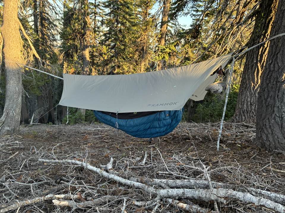The day ended with me desperately trying to find a campsite before dark. I found a place I could hang the hammock, but it was less than ideal. The slope I was on was steep — at times, I had to grab onto the hammock not slide away from it. (I kept my trekking poles on the ground beneath me to help me stabilize myself getting out of the hammock.) My ultralight camp shoes were worthless – nay, dangerous – on the steep slope. I had to hang within the ‘danger zone’ of a nearby dead tree; I hung my hammock with the head very close to a live tree with enough branches to give me hope that if the dead tree fell during the night it’d be slowed down or redirected a bit, and at least it would miss my chest & head.