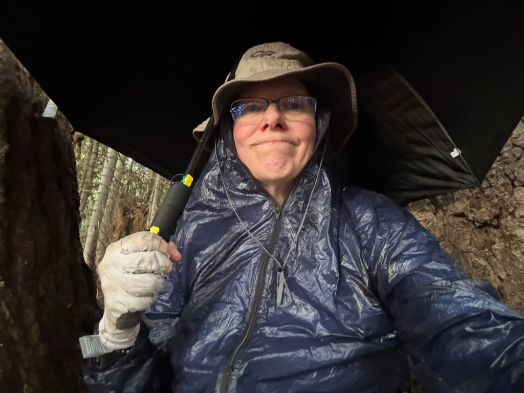 Because I’d already given up on the idea of hiking through the entire state – or even back to Ollalie Lake – any pressure I felt was gone. I just needed to make it to each resupply point. That freed me to enjoy myself a little more, to take breaks when I needed them, and to just *be*. The only downside of this day was the realization I’d lost a hiking sock. I take three pairs of socks with me on each trip. One is my camp socks — I call them my ‘foot sweaters’ because Mom knit them. They’re wool, warm, and it’s so lovely putting on a pair of warm, dry, clean socks just as I’m crawling into bed. The other pairs are hiking socks. One pair is on my feet, the other pair is hanging from my pack, airing out. I’m guessing the now-missing sock snagged in some of the brush near Fish Lake. Goodbye, old friend. I will mourn losing you — and not just because I now have one less sock to rotate through on this trip.