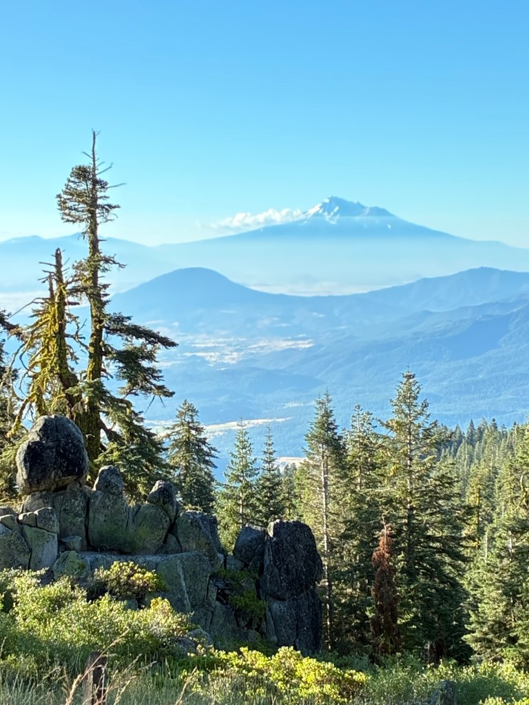 This area is dominated by views of Tans-ts’atseniptha (“rock standing up”), named Pilot Rock by later arrivals. I took a break at the trail junction to this landmark. I chatted with a hiker who told me she was thru-hiking the PCT solo to celebrate her 50th birthday. She was having an issue charging her phone because her charging cord wasn’t working. A had a compatible cord, so I let her use mine for the few minutes we were both there. She was planning to camp that night in the same area I hoped to make it to, so I let her know if I got there she could borrow my charging cord overnight.