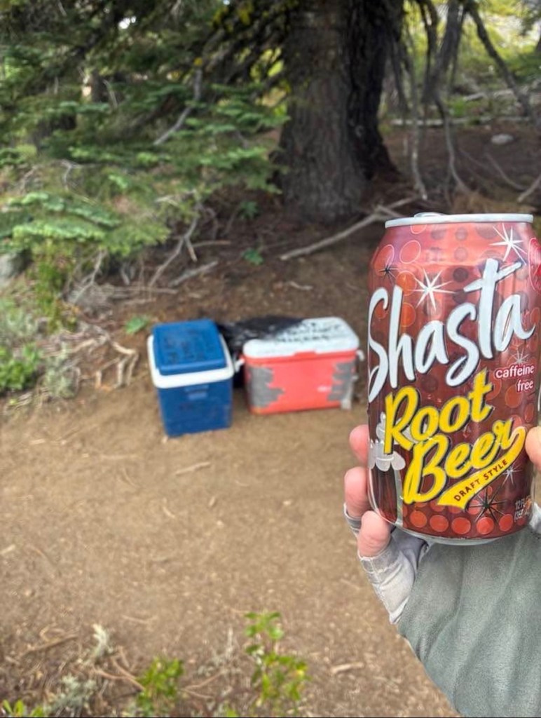 My third day was just as slow as the previous two, but it was a treat. I hiked along Mount Ashland. The Mount Ashland Road roughly parallels the Pacific Crest Trail in this area; when the PCT is covered in snow, many hikers opt to hike along the road instead of slogging through the snow. The other advantage of being so close to a frequently-traveled road – TRAIL MAGIC! There was a spot about 50′ from the road where the trail passes a grove of trees. Some kindly soul put a couple of coolers of ice-cold beverages and set up beach chairs in the shade for long-distance hikers. As I chugged my frosty root beer, I chuckled as another hiker read through the nutrition facts labels of the various sodas and yelled out “Yes! 43 grams of carbohydrate!” (Protein and fat are important, but carbs rule out here.)