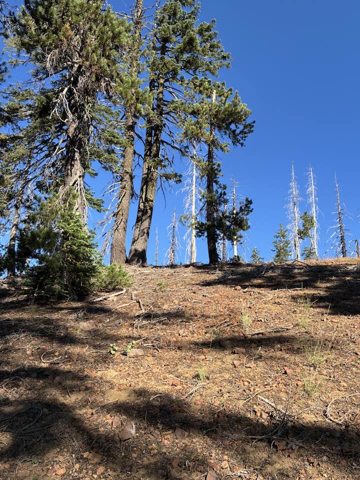 It’s about eleven miles from where I camped to Mazama Village, with about 1300′ of elevation gain and 1400′ of descent. I woke with the morning’s twilight to see a bright planet to the east. Not that I was in hurry to get up, though. I slept good, but not great. I ate breakfast on the ridge above my campsite and took in the expansive view to the west of the wilderness recovering from the wildfire. Nature always recovers; unfortunately, a century of misguided land management practices and climate change now means that fires are bigger and more frequent than nature’s natural cycles would allow for adequate recovery.